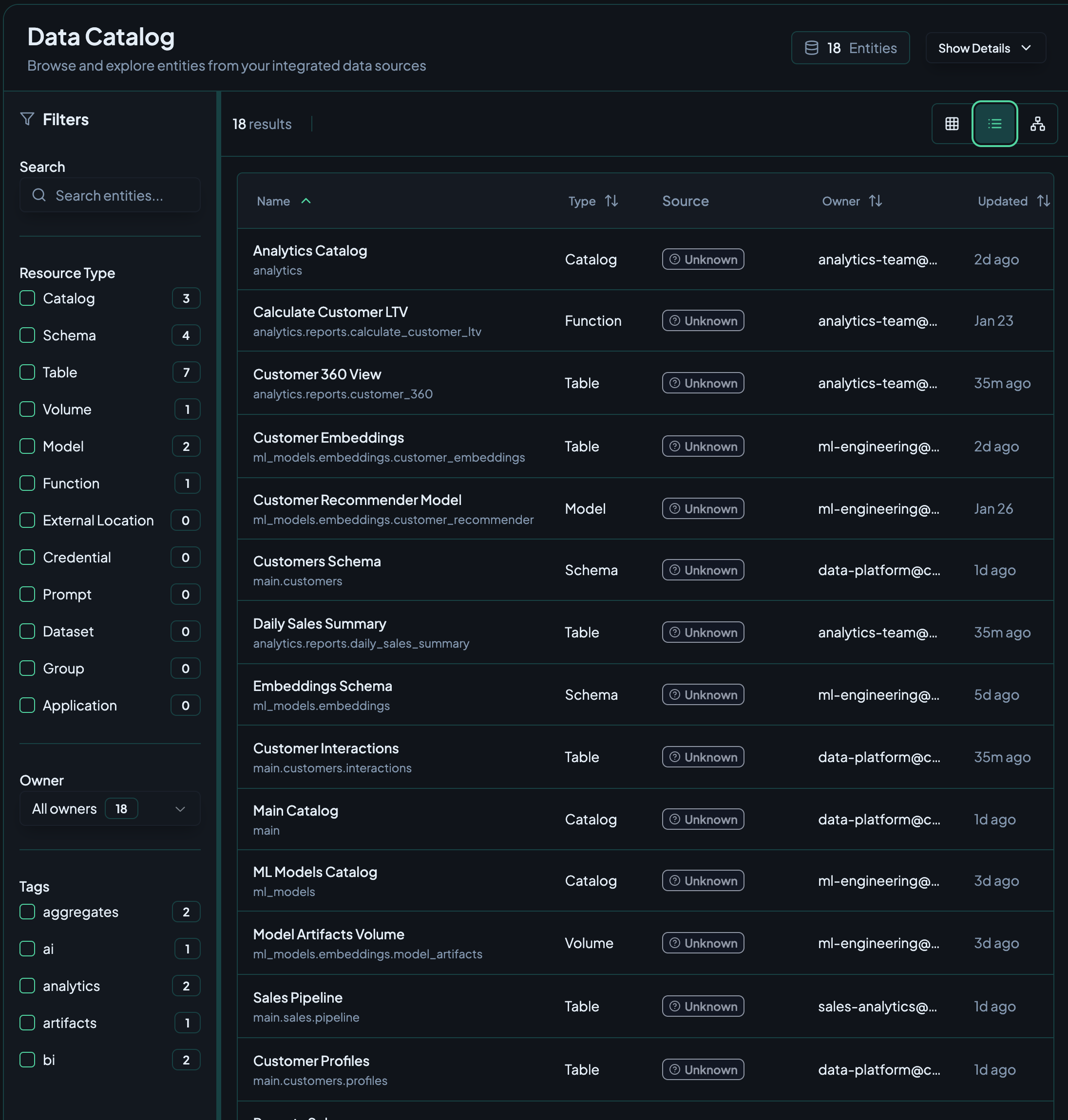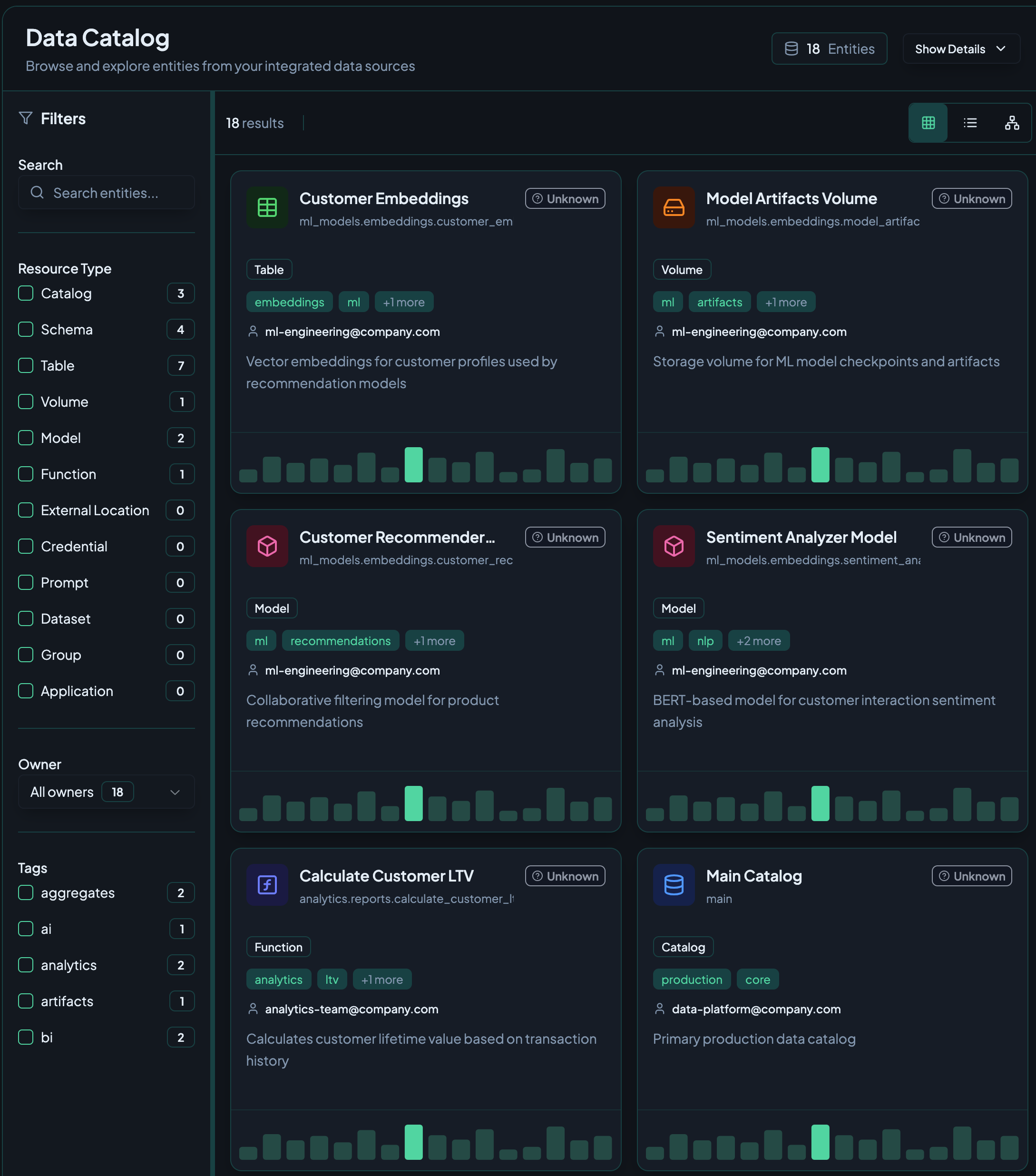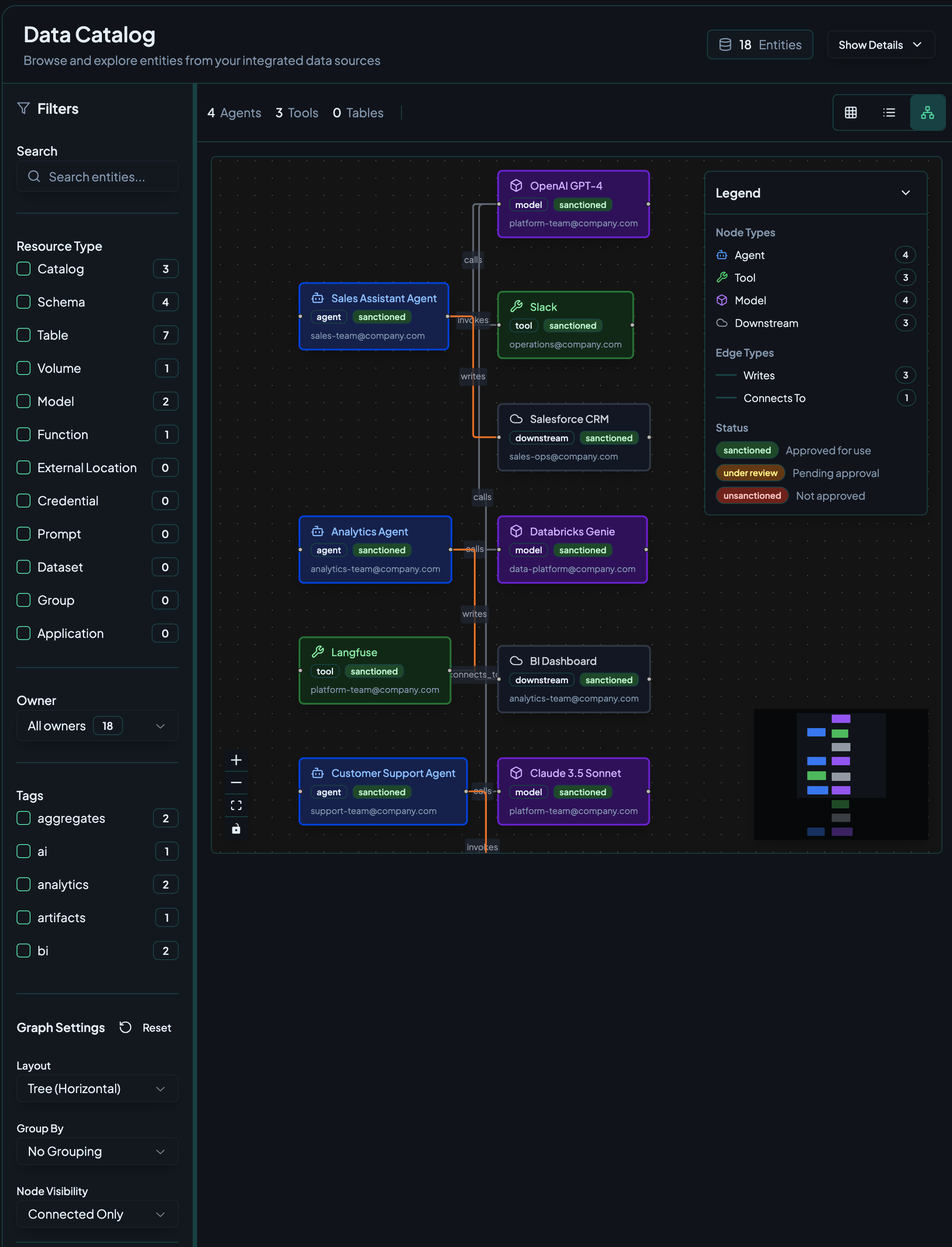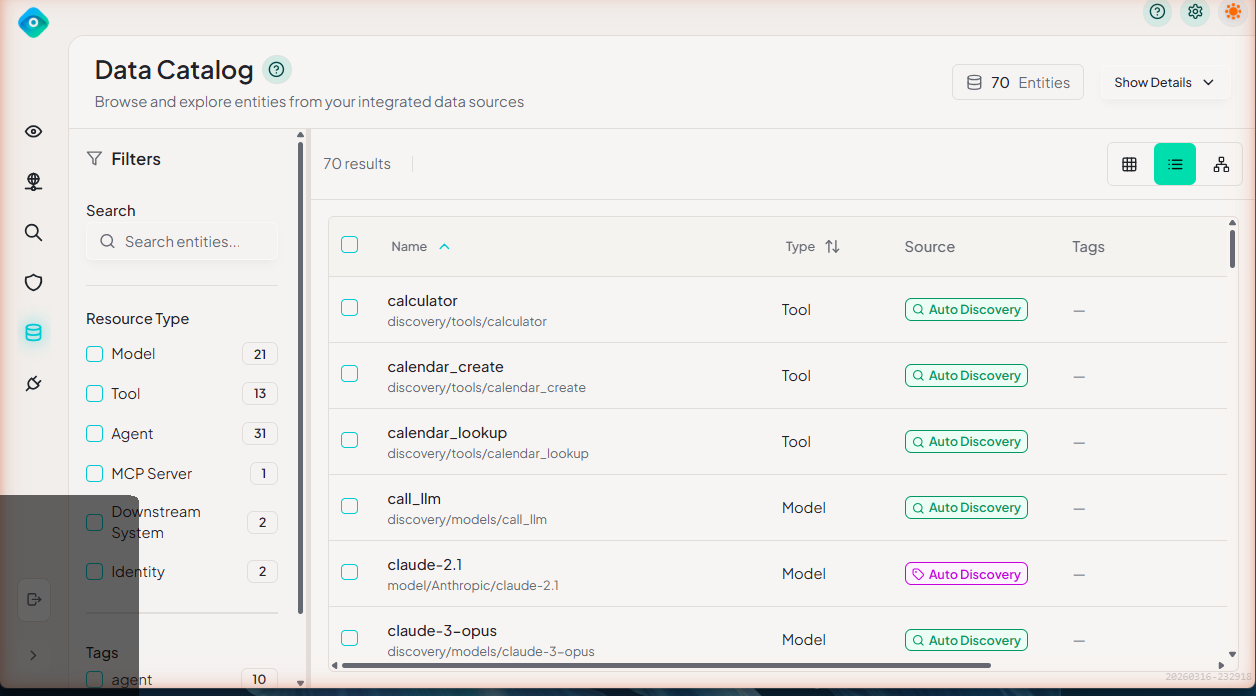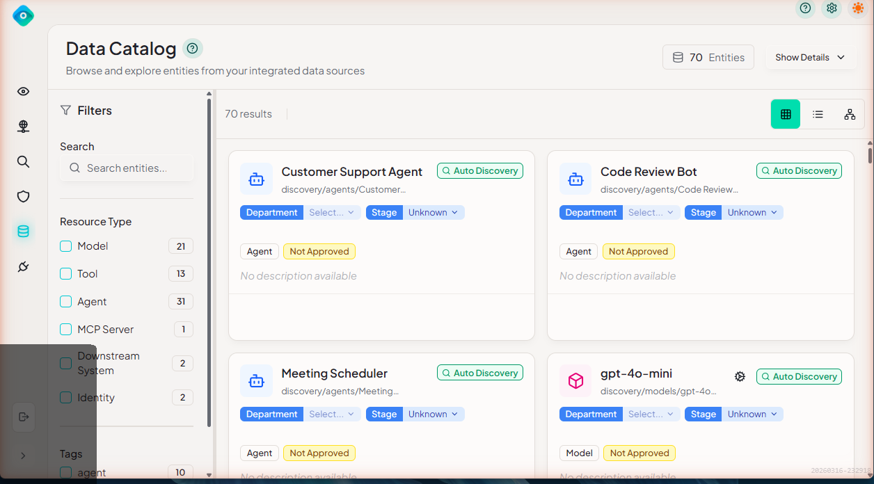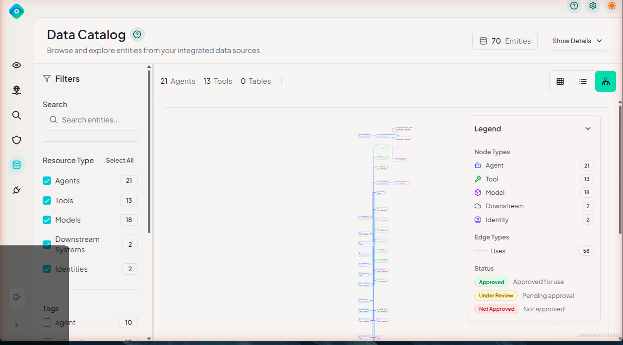 The Data Catalog provides a unified view of all AI entities discovered from your integrations, including agents, models, tools, downstream systems, and identities.