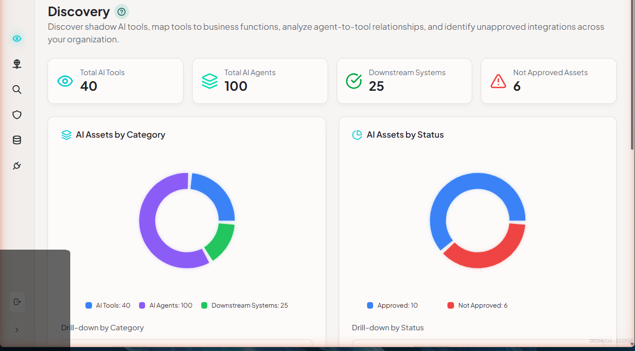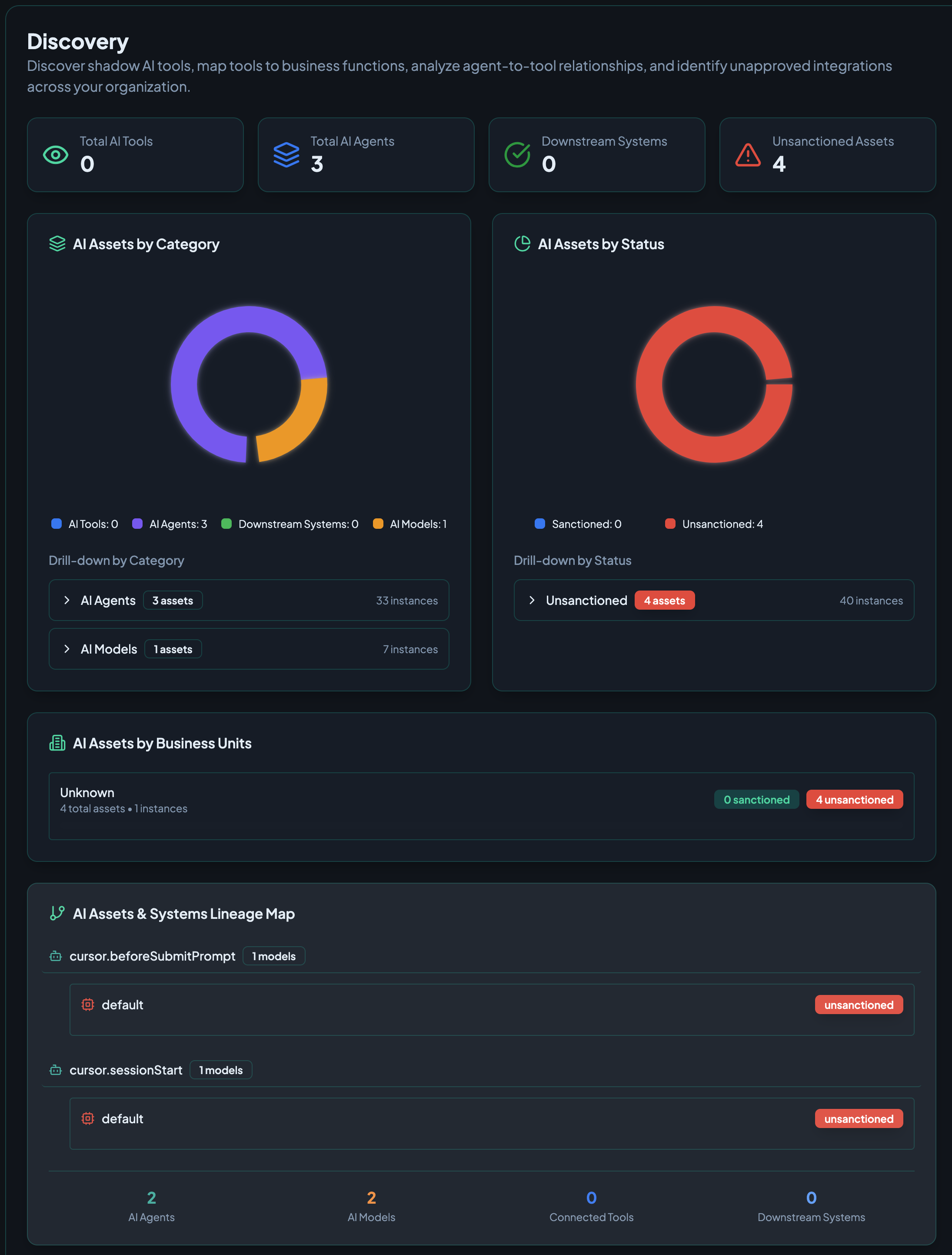 - Summary cards - Quick counts of AI Tools, Agents, Downstream Systems, and Unsanctioned Assets