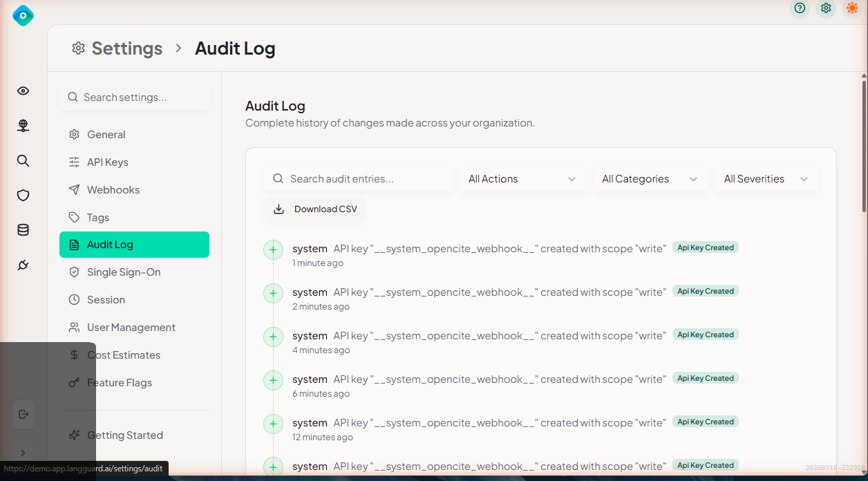 The audit log provides a tamper-proof record of all user and system actions in your LangGuard workspace.