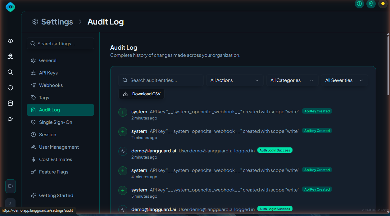 Every significant action in LangGuard is recorded in the audit log. This includes user activity, configuration changes, and system events — giving you a complete trail for compliance and security investigations.