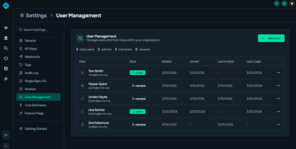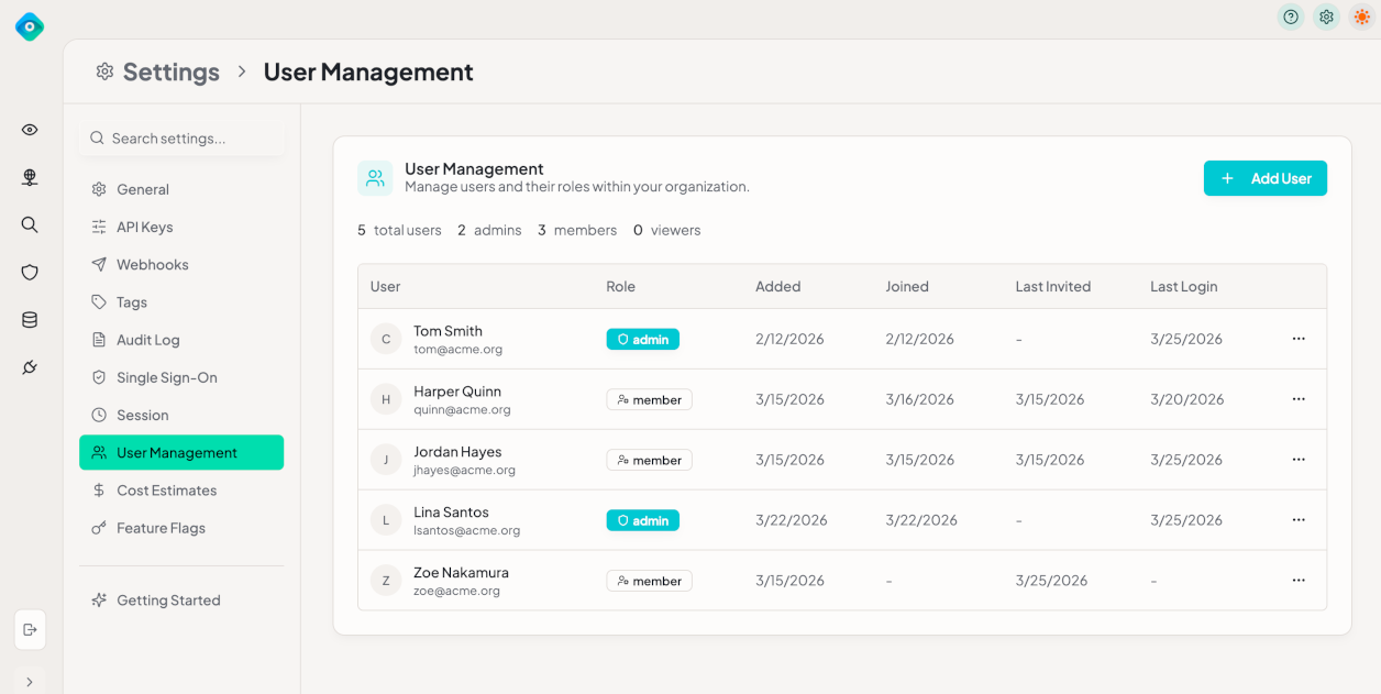 - Use SSO with role mapping — Automate role assignments via your identity provider (SSO Settings)